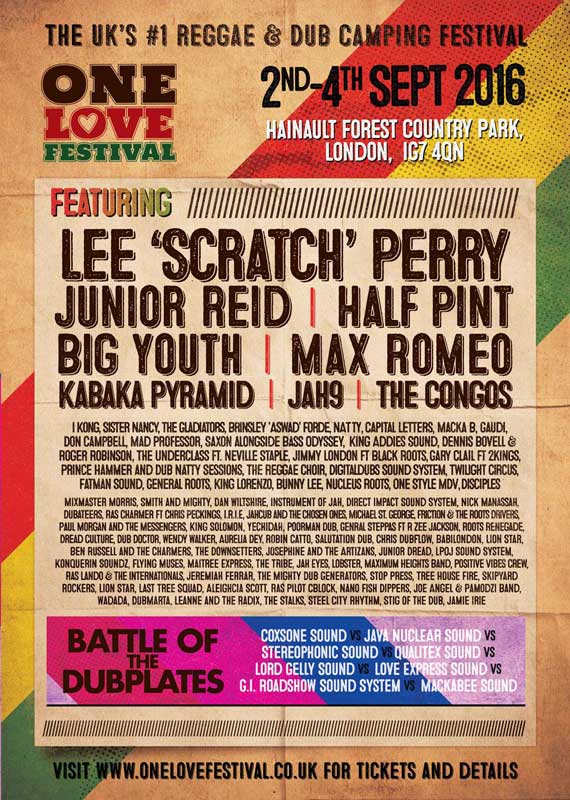 Including the unprecedented 7 Headliners Over 3 Days is Lee ‘Scratch” Perry, Max Romeo, The Congos and today’s announcement of Junior Reid, Big Youth, Half Pint, and new school roots revolution Kabaka Pyramid and Jah9 previously announced acts including Reggae kings The Gladiators, dance supremo Gaudi, UK 45’s chart hero Macka B, Brinsley ‘Aswad’ Forde, Dub collective Mad Professor, King Addis Sound, Natty, Sister Nancy, Ikong and many, many more! Unmissable and unmistakable, One Love Festival 2016 stands as the line up of the summer. ANNOUNCED TODAY: Junior Reid (co-headline) (UK Festival Exclusive) Half Pint (co-headline) (UK Festival Exclusive) Big Youth (UK Festival Exclusive) The Congos (UK Festival Exclusive) The Gladiators (UK Festival Exclusive) The Reggae Choir (UK Festival Exclusive) Battle of The Dubplates (UK Festival Exclusive) Dennis Bovell and Roger Robinson (UK Festival Exclusive) Saxon Sound Marquee (UK Festival Exclusive)