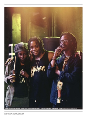 Jah9 (left) and her manager Samo (right) enjoy a moment with Chronixx's manager, Daddi Barnz (center) Photo by Joachim Maquet 86 REGGAE FESTIVAL GUIDE 2017