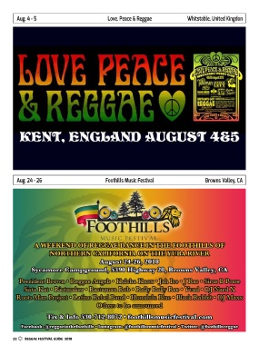 Aug. 4 - 5 Love, Peace & Reggae Whitstable, United Kingdon Aug. 24 - 26 Foothills Music Festival Browns Valley, CA 22 Reggae Festival guide 2018