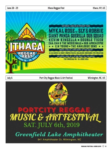 June 28 - 29 Ithaca Reggae Fest Ithaca, NY, US July 6 Port City Reggae Music & Art Festival Wilmington, NC, US Reggae Festival guide 2019 11