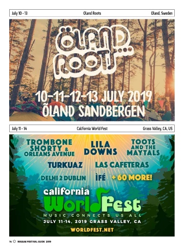 July 10 - 13 Oland Roots Oland, Sweden July 11 - 14 California World Fest Grass Valley, CA, US 14 Reggae Festival guide 2019
