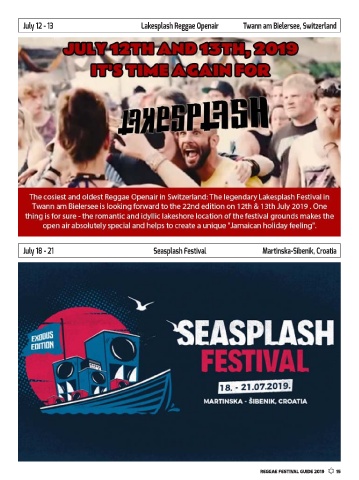 July 12 - 13 Lakesplash Reggae Openair Twann am Bielersee, Switzerland July 18 - 21 Seasplash Festival Martinska-Sibenik, Croatia Reggae Festival guide 2019 15