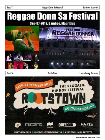 Sept. 7 Reggae Donn Sa Festival Bamboo, Mauritius Sept. 14 Roots Town Luxembourg, Germany Reggae Festival guide 2019 23