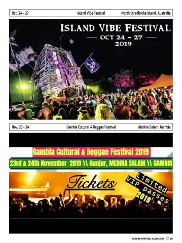 Oct. 24 - 27 Island Vibe Festival North Stradbroke Island, Australia Nov. 23 - 24 Gambia Cultural & Reggae Festival Medina Salam, Gambia Reggae Festival guide 2019 25