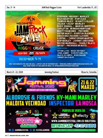 Dec. 9 - 14 JAM Rock Reggae Cruise Fort Lauderdale, FL, US March 21 - 22, 2020 Jamming Festival Ricaurte, Colombia 26 Reggae Festival guide 2019