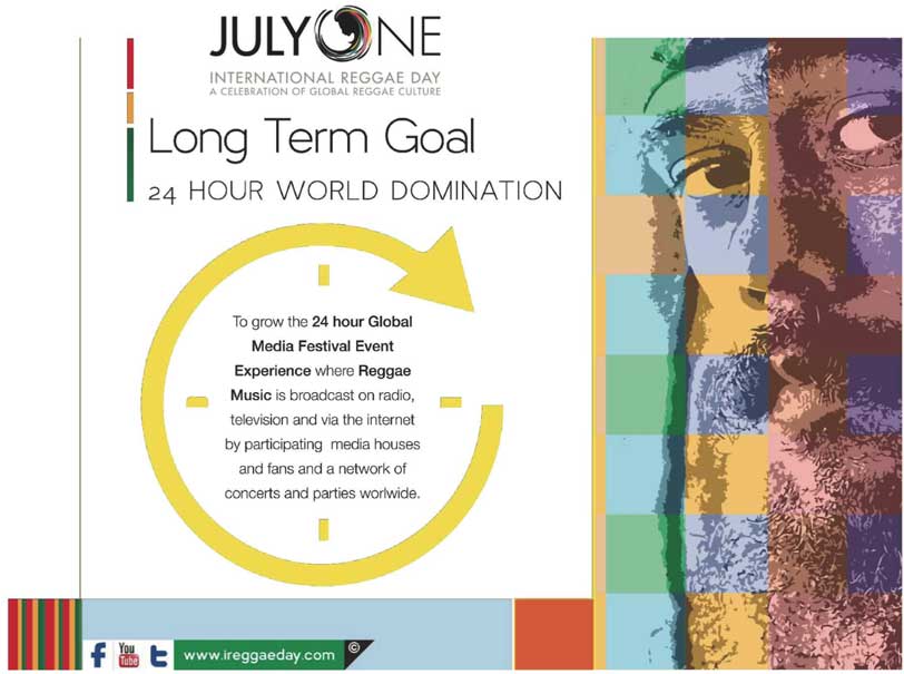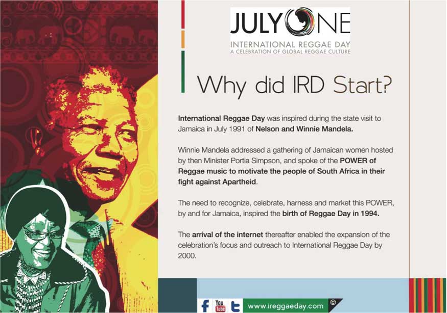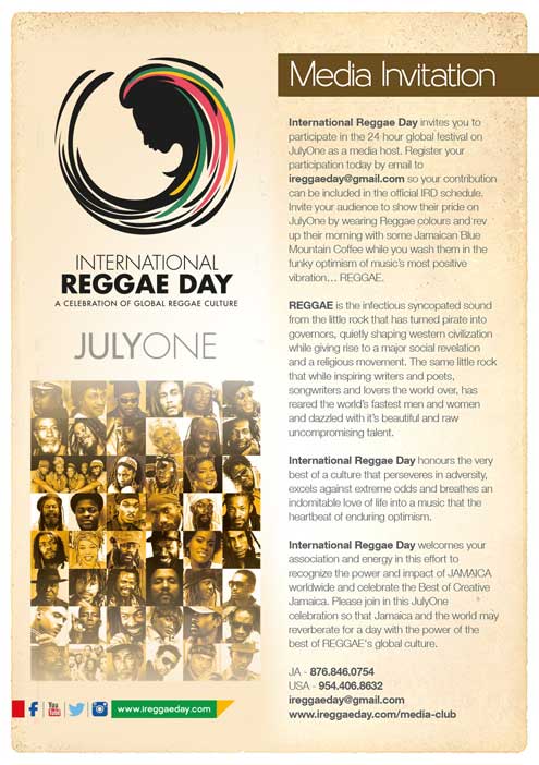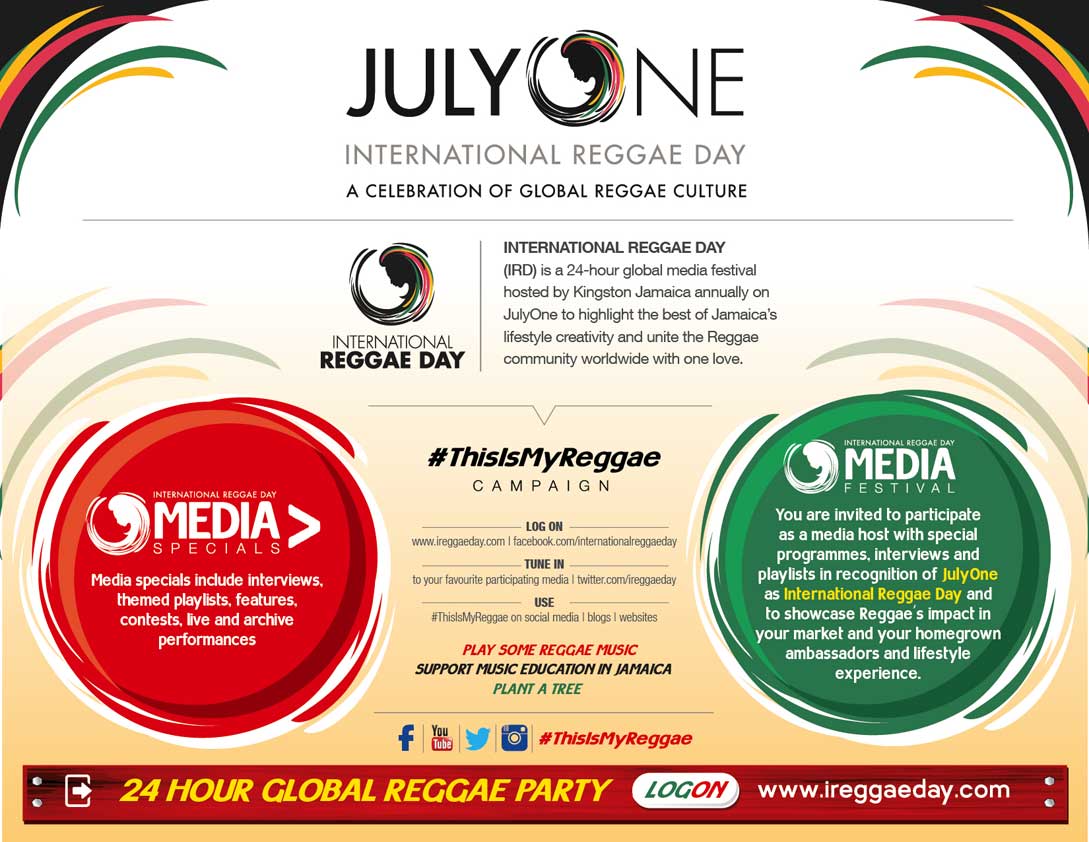 International Reggae Day (IRD) is the first ever annual calendar event to be officially proclaimed and dedicated to celebrating the best of Jamaica’s lifestyle music and its impact on global culture. The annual initiative seeks to mobilize the music lovers in the global Reggae community on JulyOne to build bridges and deepen the appreciation for Jamaica’s creative legacy. IRD showcases the influence of Jamaica’s creative entrepreneurs and their global offspring by using the power of music, media, visual arts and technology.