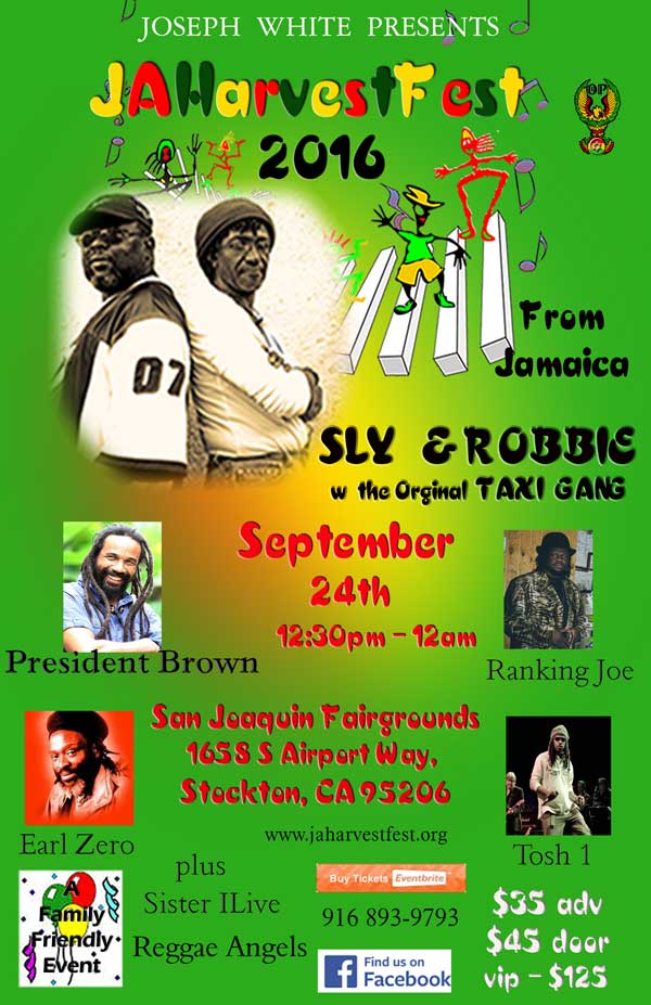 JaHarvestFest is on Saturday, September 24 at the San Joaquin Fairgrounds in Stockton, CA. Featured bands include the legendary Sly & Robbie with the Original Taxi Gang, Prezident Brown, Rankin Joe, Tosh 1, Earl Zero and more.